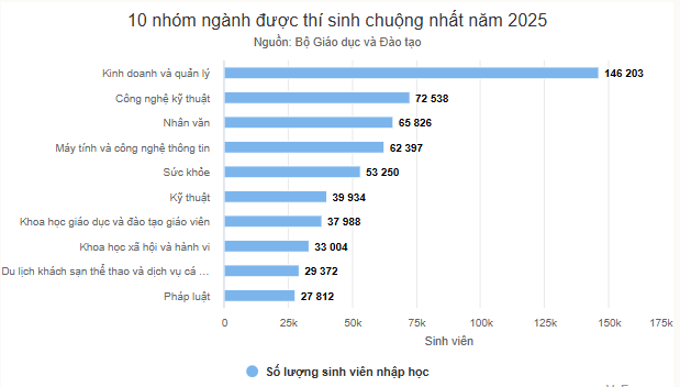 Trong số hơn 681.000 thí sinh nhập học đại học, hơn 146.000 em chọn nhóm ngành Kinh doanh quản lý, tỷ lệ 21%. Đây là lĩnh vực được nhiều trường đào tạo, phổ biến là các ngành Quản trị kinh doanh, Tài chính - Ngân hàng, Kế toán - Kiểm toán, Marketing,.. Tuy nhiên, so với năm 2024, tỷ lệ chọn nhóm ngành này đã giảm 4%.