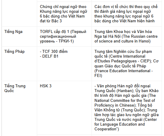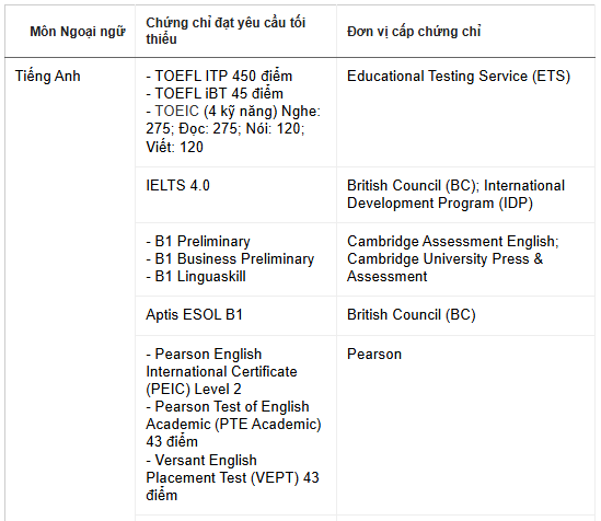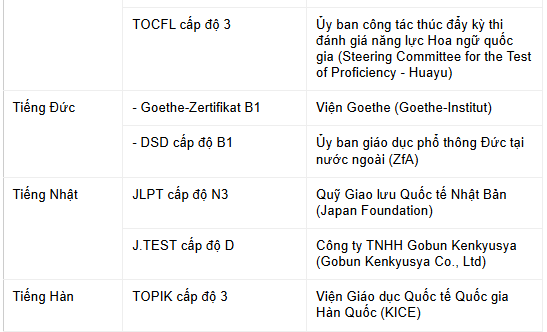 Danh sách các chứng chỉ được miễn thi môn Ngoại ngữ như sau: