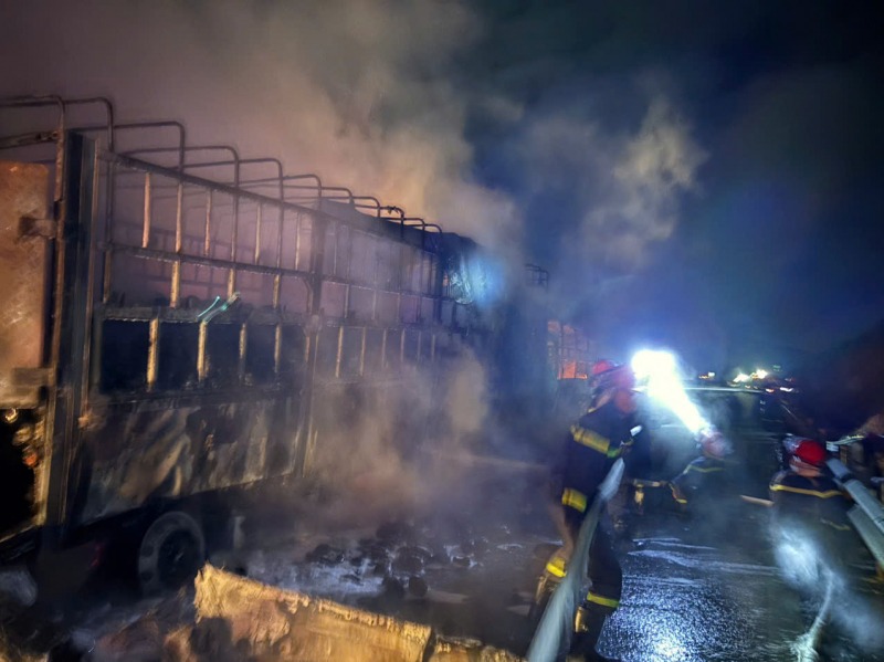 Tuy nhiên lúc này hỏa hoạn đã bùng phát mạnh, ngọn lửa phủ kín cả 3 xe tải. Lực lượng Cảnh sát phải nỗ lực phun nước gần 1 giờ mới dập tắt đám cháy. Vụ cháy không gây thương vong về người vì tài xế và phụ xe trên 3 chiếc xe tải đã kịp thoát ra ngoài. Nhưng các ô tô tải BKS 50H-408.23 và 89C-203.05 bị thiêu rụi hoàn toàn chỉ còn lại khung sắt. Phương tiện thứ ba là xe đầu kéo BKS 77C-172.89 bị cháy rụi đầu ca bin, còn lại phần rơ moóc.
