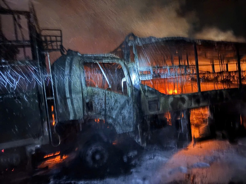 Vụ cháy không gây thương vong về người nhưng 2 xe tải bị thiêu rụi hoàn toàn, 1 xe bị thiêu rụi đầu ca bin. |