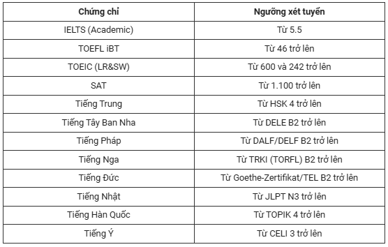 Ngoài ra, yêu cầu thí sinh xếp loại học lực năm lớp 10, 11, 12 đạt loại khá trở lên. Trong đó, điểm trung bình chung môn ngoại ngữ các năm học THPT đạt từ 7,0 điểm trở lên.