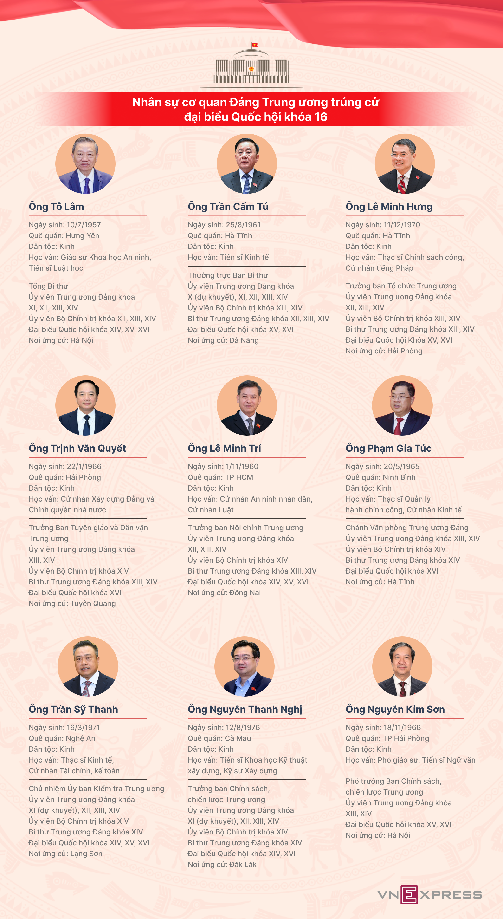 Trong 9 đại diện cơ quan Đảng Trung ương được bầu làm đại biểu Quốc hội khóa 16 có Tổng Bí thư Tô Lâm và 8 lãnh đạo các Ban Đảng.