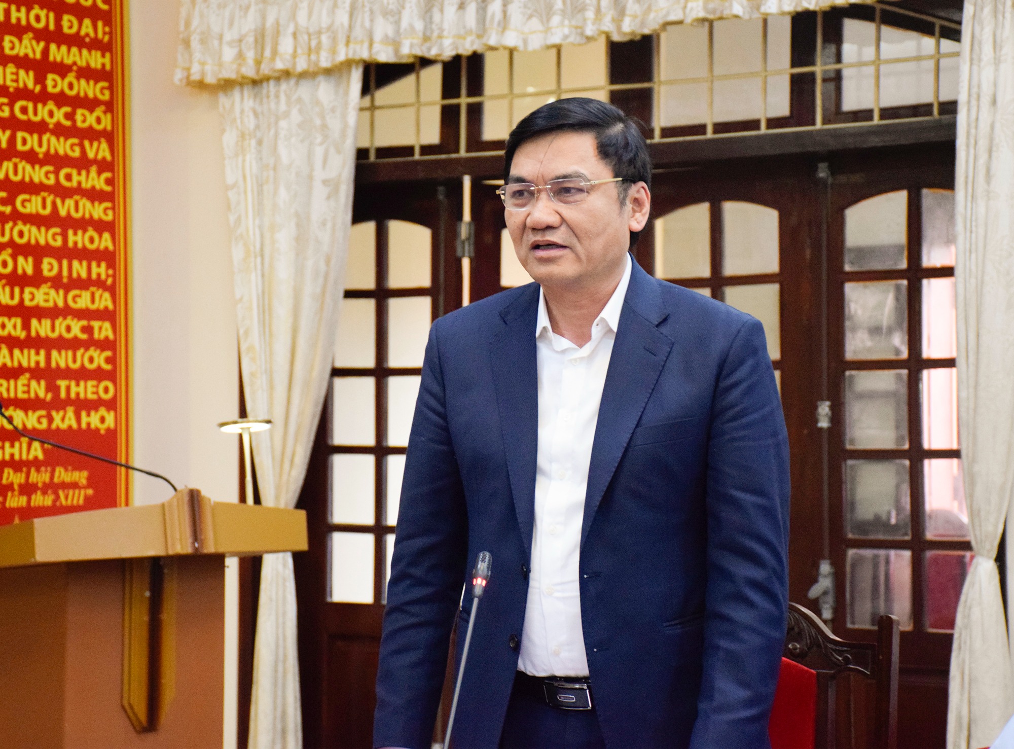 Phó Chủ tịch UBND tỉnh Hoàng Phú Hiền báo cáo tiến độ các dự án trọng điểm phụ trách; đồng thời đề nghị các địa phương tập trung xây dựng các khu tái định cư dự án Đường sắt tốc độ cao trên trục Bắc – Nam |