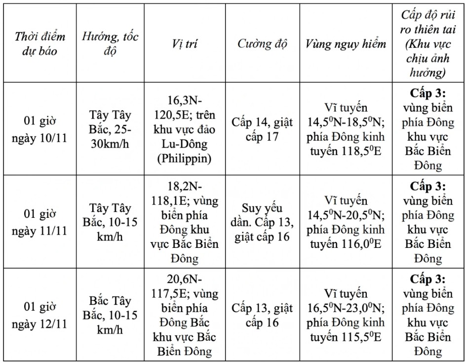 Cảnh báo: Trong khoảng ngày 10-12/11, vùng biển phía Đông khu vực Bắc Biển Đông có khả năng chịu tác động của gió bão mạnh cấp 11-13, giật cấp 16, sóng biển cao 8,0-10,0m. Biển động dữ dội.