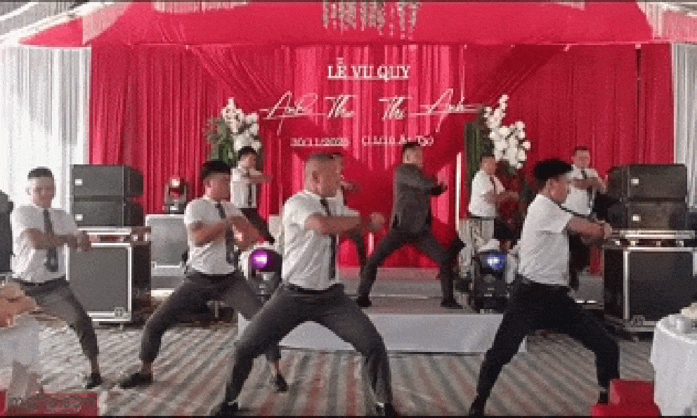 Màn múa võ uy dũng của bố cô dâu cùng bạn khiến tất cả đều không khỏi thích thú.