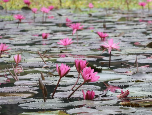Trên những dòng nước phẳng lặng uốn quanh núi đá vôi, những bông súng vươn mình đón nắng sớm, tạo nên khung cảnh vừa hoang sơ, vừa thơ mộng.