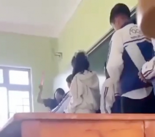 Một nữ sinh bị nhóm bạn túm tóc, dùng mũ bảo hiểm, tay chân đánh liên tiếp vào đầu, mặt trong ngày khai giảng năm học mới.
