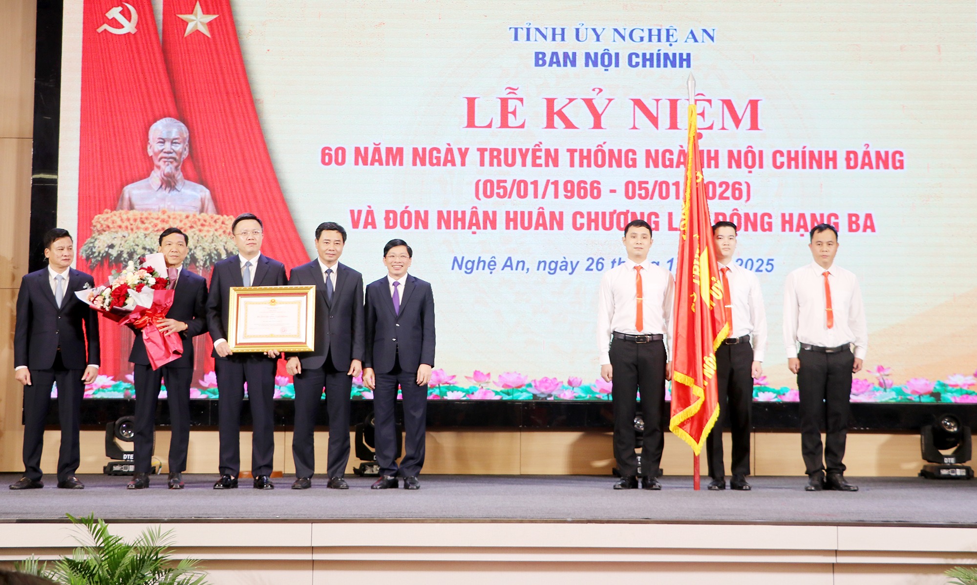 Chiều nay (26/12), Ban Nội chính Tỉnh uỷ tổ chức trọng thể Lễ Kỷ niệm 60 năm Ngày truyền thống ngành Nội chính Đảng (05/01/1966 - 05/01/2026) và đón nhận Huân chương Lao động hạng Ba.