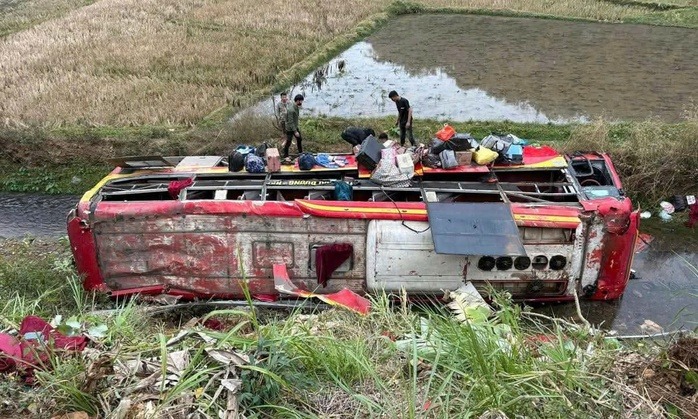 Xe khách chở 25 người chạy trên quốc lộ 37, đến xã Phiêng Pằn thì đâm đổ hộ lan rồi lao xuống mương nước khiến 11 hành khách bị thương, sáng 5/1.