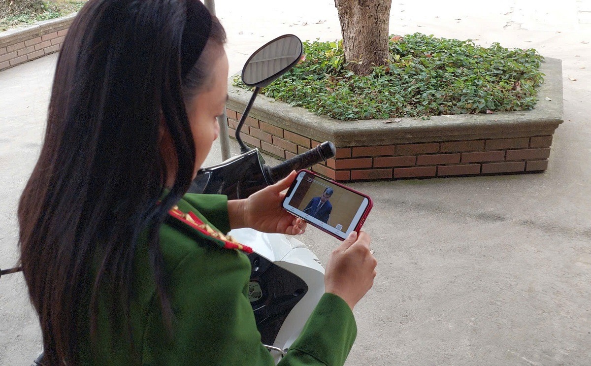 Một nữ cán bộ công an xã theo dõi Hội nghị quán triệt Nghị quyết qua điện thoại trong quá trình công tác tại cơ sở |