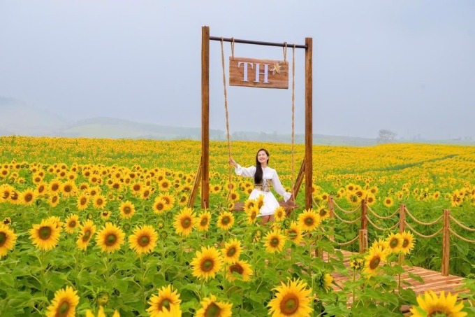Khách tham quan có hơn 10 điểm check-in trên cánh đồng hoa hướng dương. Ảnh: Tập đoàn TH |