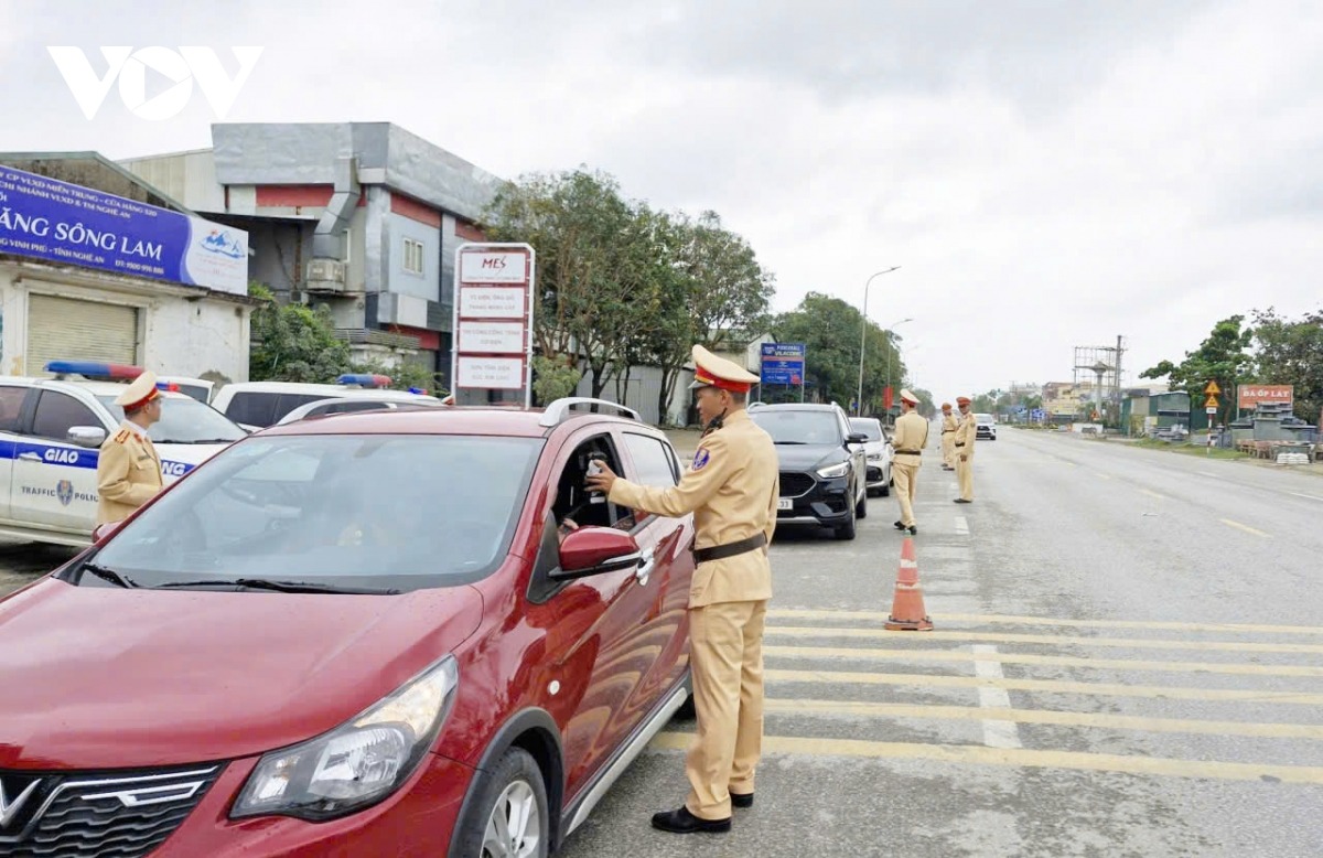 Đây là một trong những nội dung trọng tâm của kế hoạch cao điểm bảo đảm trật tự, an toàn giao thông dịp nghỉ Tết năm nay. Theo đại diện Cục Cảnh sát giao thông, căn cứ lịch nghỉ Tết của người lao động từ ngày 14/2 đến hết 22/2, lực lượng cảnh sát giao thông toàn quốc sẽ ứng trực 100%, triển khai cao điểm bảo đảm an toàn giao thông kéo dài thêm 2 ngày trước và sau kỳ nghỉ. (Trong ảnh là chốt kiểm tra nồng độ cồn tại địa bàn phường Vinh Phú (Nghệ An). |