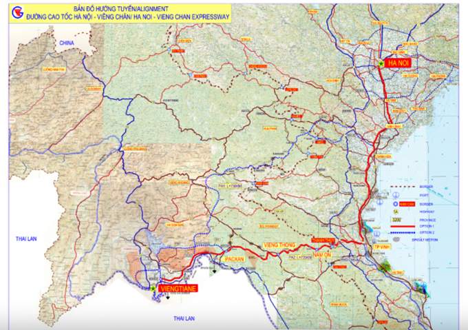Sơ đồ tuyến cao tốc Hà Nội - Viêng Chăn, trong đó có đoạn Vinh - Thanh Thuỷ. Nguồn: Bộ Giao thông vận tải |