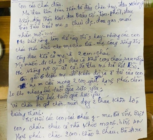 "Mẹ biết rằng làm như vậy là không hay, nhưng các con, các cháu hãy thấu hiểu cho mẹ, cho bà. Càng sống mẹ càng đau khổ, cả mẹ và các con, các cháu đều khổ…", bà N. để lại lời nhắn trong thư.