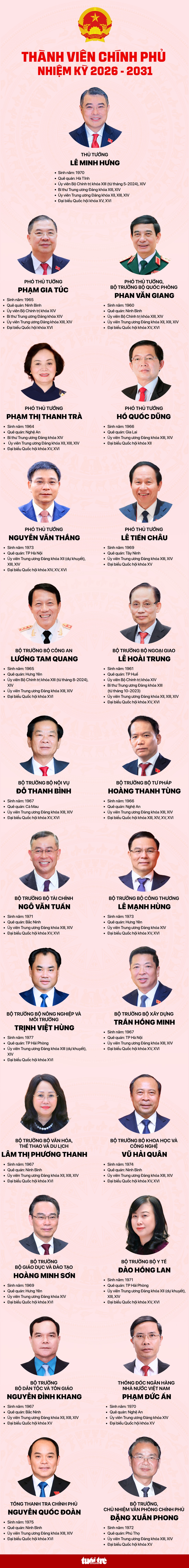 Dưới đây là chân dung Thủ tướng Lê Minh Hưng, các Phó thủ tướng, Bộ trưởng, thành viên Chính phủ nhiệm kỳ 2026 - 2031. Mời bạn đọc cùng theo dõi.