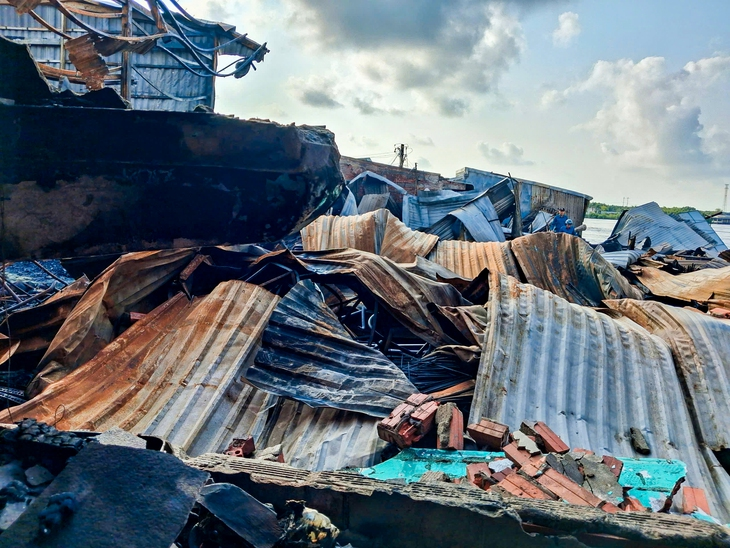 Mặc dù dãy nhà nằm ven sông nhưng công tác chữa cháy gặp khó do nhà liền kề, lửa lan nhanh - Ảnh: THANH HUYỀN |