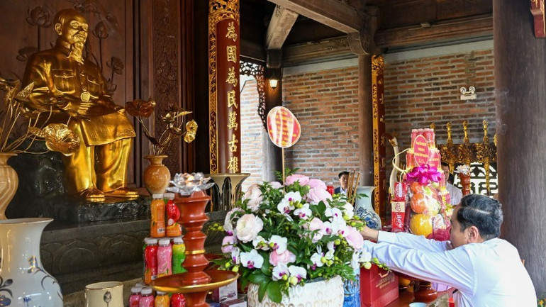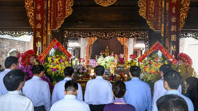 Trước đó, Chủ tịch Quốc hội Trần Thanh Mẫn cùng đoàn đại biểu đến dâng hương tại đền Chung Sơn - đền thờ gia tiên Chủ tịch Hồ Chí Minh. |