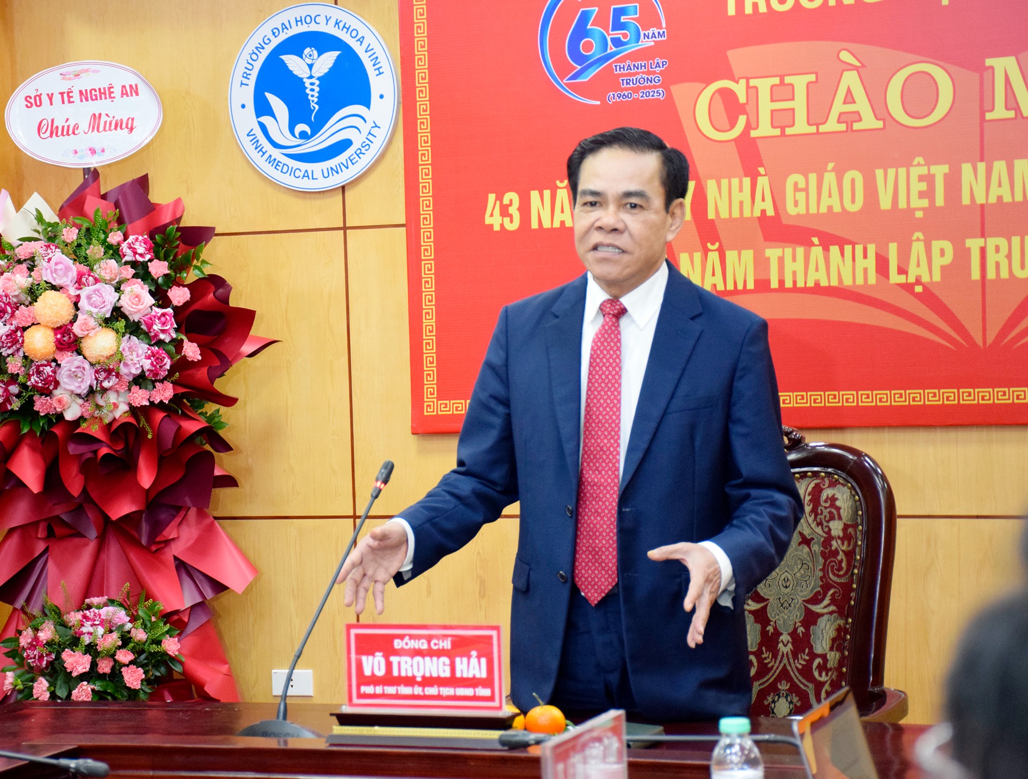 Tại Trường Đại học Y khoa Vinh, Chủ tịch UBND tỉnh Võ Trọng Hải bày tỏ sự vui mừng và vinh dự được đại diện Tỉnh ủy, HĐND, UBND, Ủy ban MTTQ tỉnh đến thăm và gửi lời chúc mừng nồng nhiệt và lòng tri ân sâu sắc nhất đến toàn thể thầy giáo, cô giáo, cán bộ, viên chức của Nhà trường.