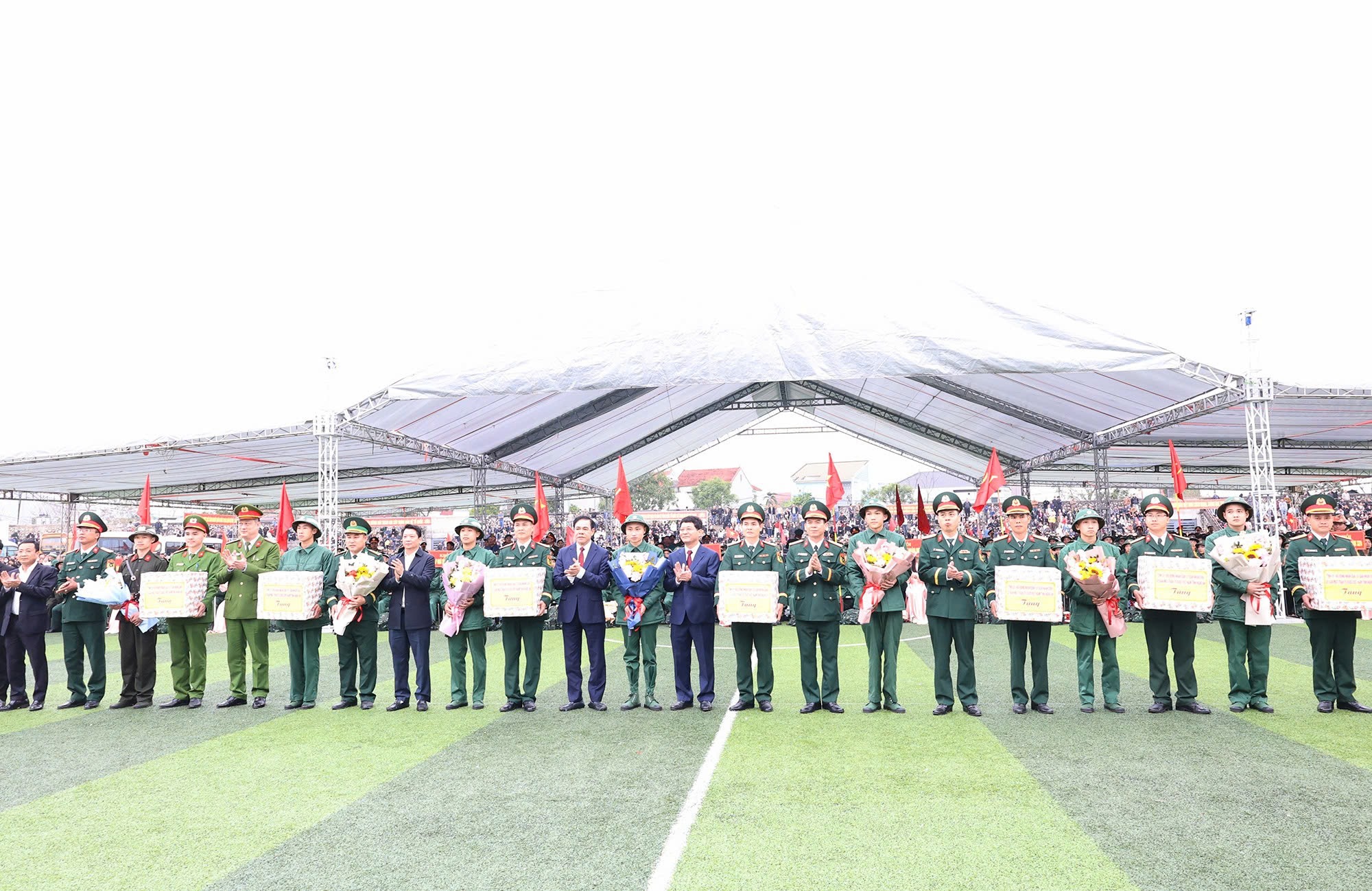 Chủ tịch UBND tỉnh Võ Trọng Hải cùng các đại biểu tặng hoa cho các đơn vị nhận quân |