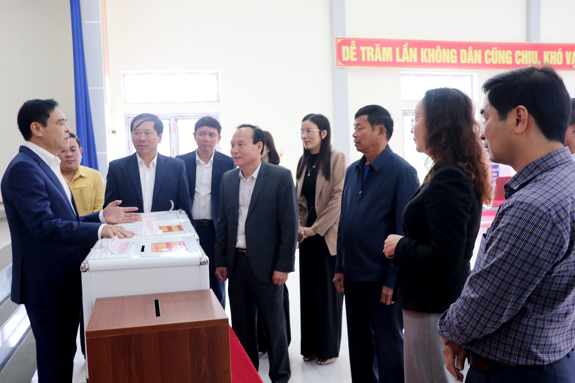 Chủ tịch UBND tỉnh Võ Trọng Hải trao đổi về quy trình bỏ phiếu bầu cử đảm bảo đúng quy định tại điểm bỏ phiếu xóm Bắc Thung, xã Vạn An |