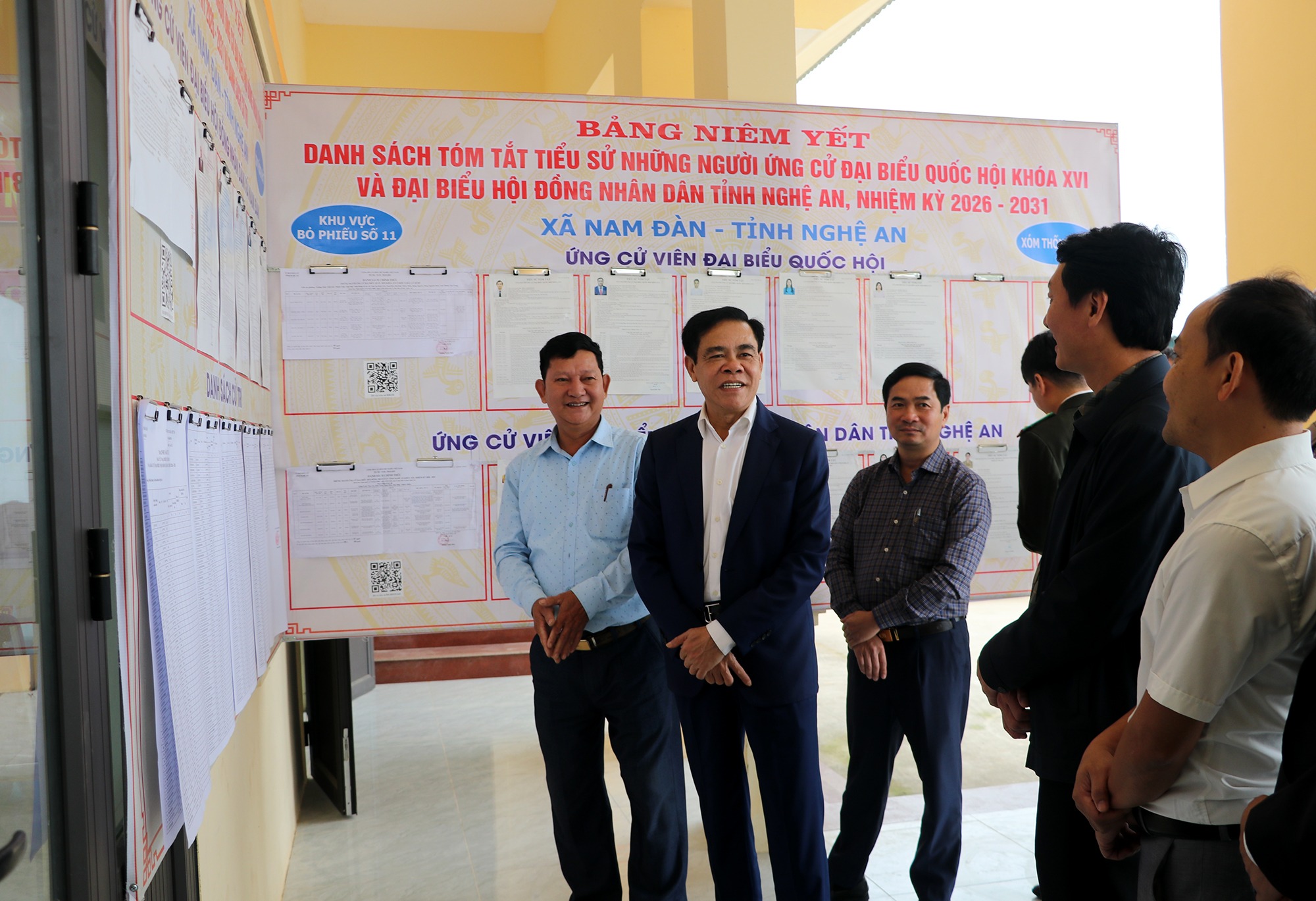 Đoàn kiểm tra khu vực bỏ phiếu tại Nhà văn hóa xóm Thống Nhất, xã Nam Đàn. Khu vực này có 379 cử tri tham gia bỏ phiếu |