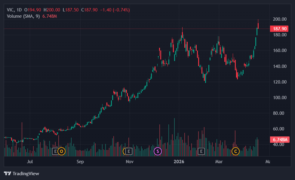 Nếu tính từ vùng đáy ngắn hạn 123.000 đồng/cổ phiếu thiết lập trong phiên 24/3, VIC đã ghi nhận mức tăng hơn 50% chỉ trong chưa đầy một tháng.