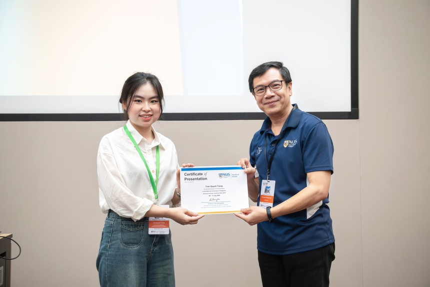 Trang đạt giải báo cáo xuất sắc tại hội nghị báo cáo khoa học của Đại học Quốc Gia Singapore. |