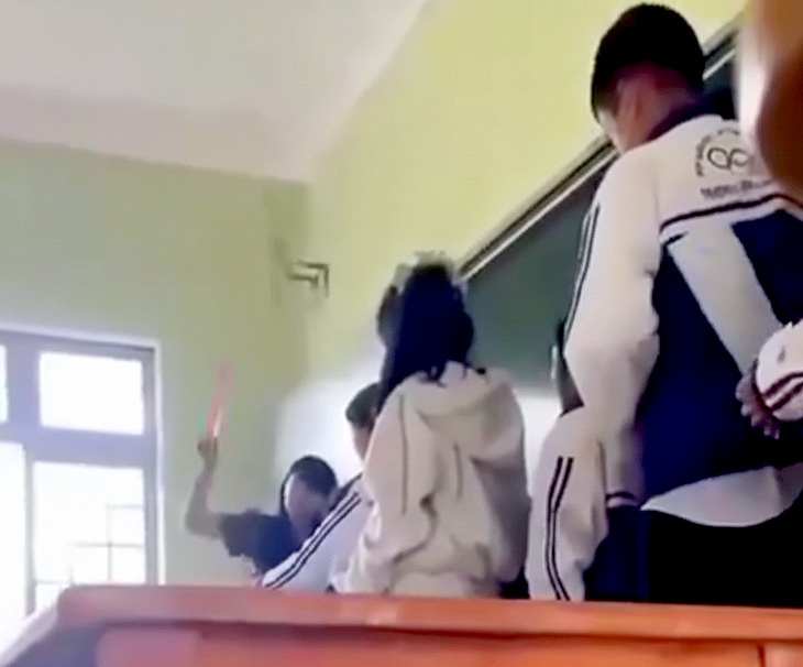 Hình ảnh ghi lại thời điểm cô giáo dạy hóa ở Trường THPT Anh hùng Núp - Gia Lai cho học sinh xếp hàng và dùng thước kẻ đánh vào tay các em - Ảnh: MXH |