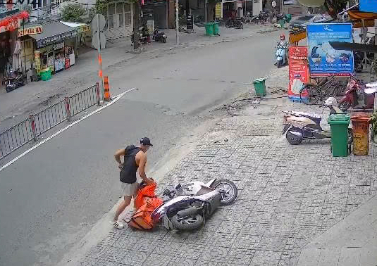 Không dừng lại, người đàn ông còn đạp ngã xe máy của nữ shipper rồi cầm hộp cơm rời đi.