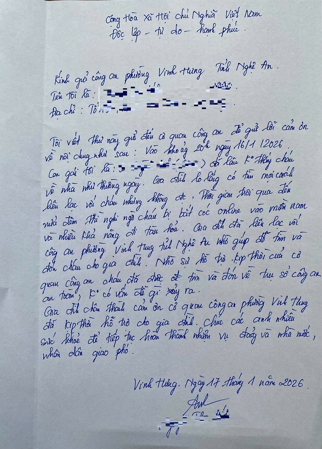 Gia đình em A. viết thư cảm ơn Công an phường Vinh Hưng |
