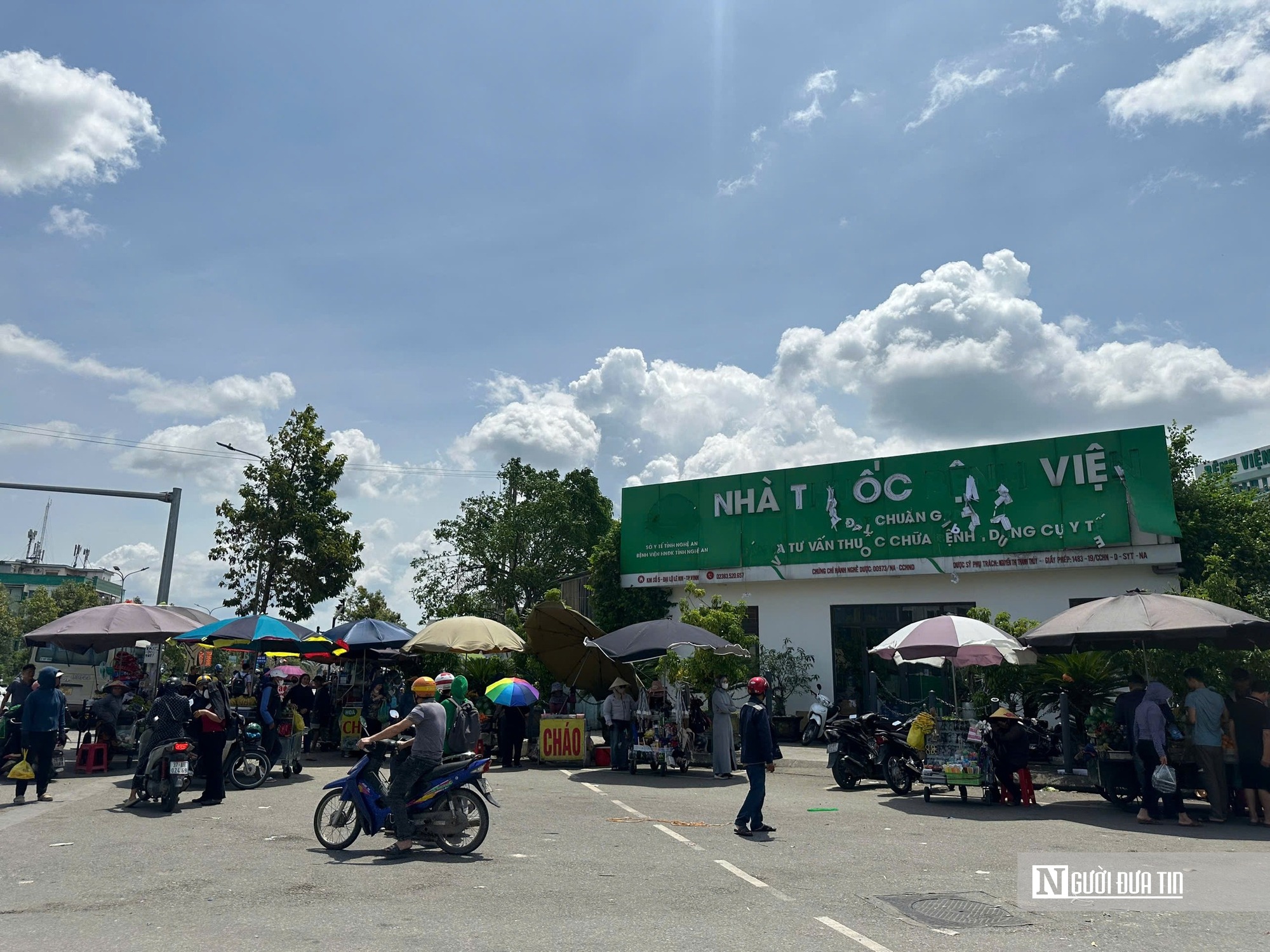 Có mặt tại cổng Bệnh viện Hữu nghị Đa khoa Nghệ An (phường Vinh Phú, tỉnh Nghệ An), phóng viên ghi nhận nhiều hàng quán, gánh hàng rong chen chúc, ngang nhiên bày bán đủ loại đồ ăn, nước uống, hoa quả, đồ dùng thiết yếu.