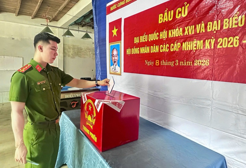 Cử tri là cán bộ Công an đặc khu Thổ Châu bỏ phiếu bầu. |