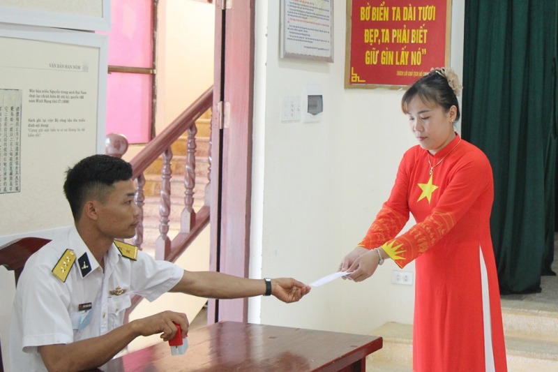 Cán bộ, chiến sĩ và người dân đang sinh sống, thực thi nhiệm vụ trên đảo Sinh Tồn, đặc khu Trường Sa nhận phiếu bầu cử.