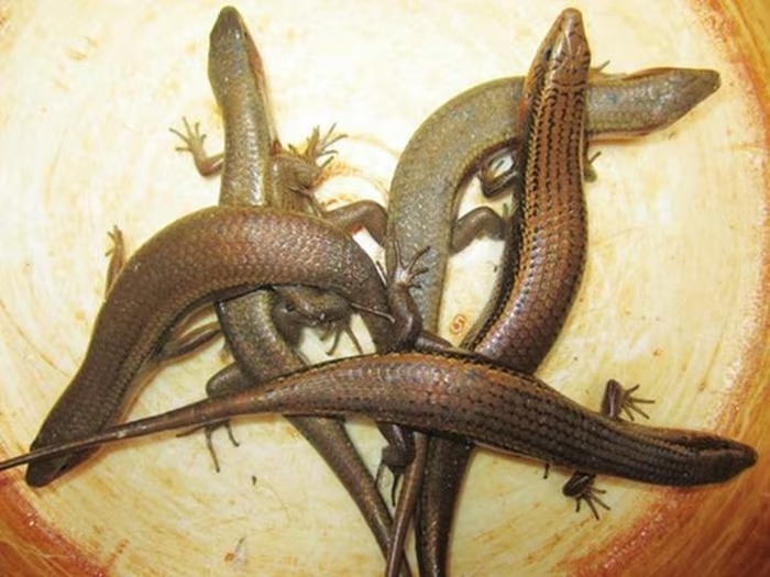 Loài đặc sản khiến nhiều người rùng mình khi nghe tên chính là rắn mối. Đây là một loài bò sát có hình dáng khá giống thạch sùng nhưng kích thước lớn hơn, toàn thân phủ lớp vảy bóng loáng. Chúng thường xuất hiện trong các bụi rậm khô ven vườn, dưới gốc cây mục hoặc những nơi có nhiều lá khô.