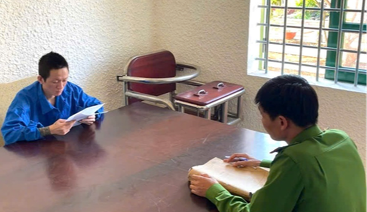 Đại diện cơ quan điều tra tống đạt bản kết luận điều tra đề nghị truy tố bị can Sơn - Ảnh: Công an tỉnh Đắk Lắk |