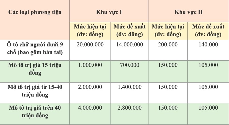Mức giảm này áp dụng cho cả ô tô và xe máy khi đăng ký và cấp biển số lần đầu. Theo đó, người dân tại các tỉnh, thành thuộc khu vực I như Hà Nội, TPHCM khi đăng ký ô tô chở người từ 9 chỗ trở xuống (bao gồm xe bán tải) sẽ chỉ mất 14 triệu đồng thay vì 20 triệu đồng như trước đây (tiết kiệm được 6 triệu đồng). Dự kiến mức thay đổi theo đề xuất áp dụng đối với cả ô tô và xe máy như sau: