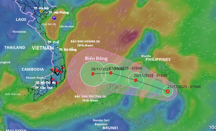 Theo Trung tâm Dự báo khí tượng thủy văn quốc gia lúc 1h sáng 25-11, tâm áp thấp nhiệt đới đang ở trên khu vực miền trung Philippines, sức gió mạnh nhất vùng gần tâm áp thấp nhiệt đới mạnh cấp 7 (50-61km/h), giật cấp 9.
