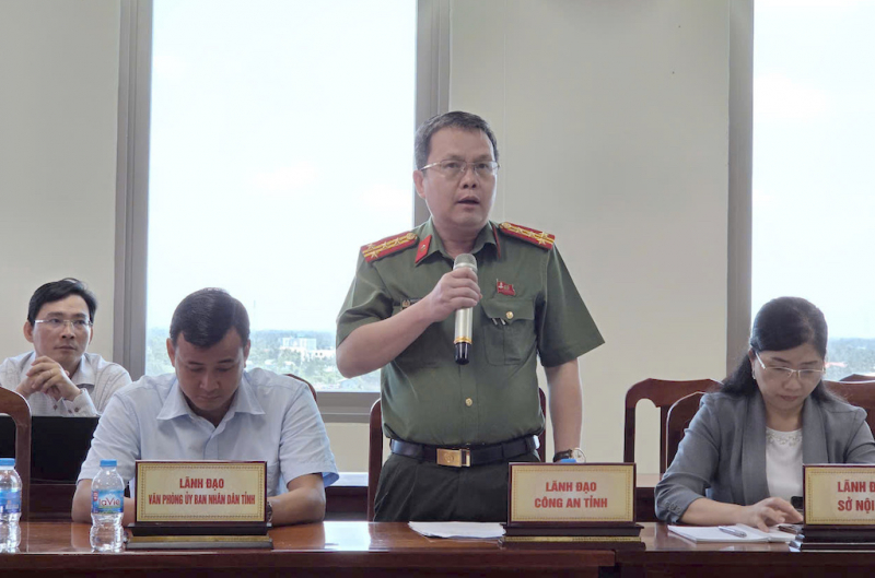 Đại tá Nguyễn Minh Tân, Phó Giám đốc Công an tỉnh Đồng Tháp thông tin tại hội nghị. |