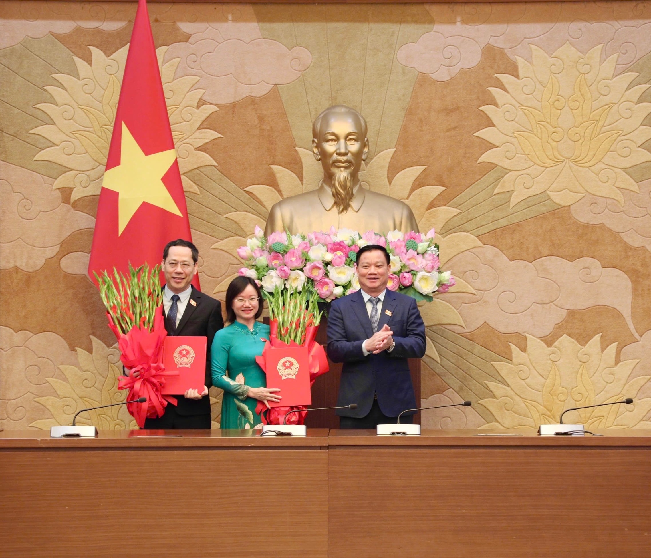 Bí thư Tỉnh ủy Nguyễn Khắc Thận chúc mừng Phó Trưởng Đoàn chuyên trách Thái Thị An Chung và ĐBQH chuyên trách Đoàn ĐBQH tỉnh Trần Nhật Minh. Ảnh: Khánh Duy |