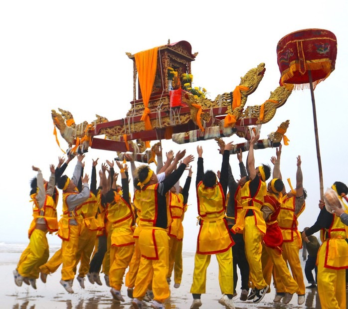 Những người được chọn là tham gia rước kiệu vào đền là những thanh niên trai tráng, ngư phủ khỏe mạnh nhất trong vùng. Những chiếc kiệu được các chàng trai khỏe mạnh khiêng trên vai, lúc thì chạy, lúc thì tung lên cao trong tiếng reo hò cổ vũ của đông đảo du khách. Kiệu càng được tung cao, rước hồ hởi nhất thì càng mang lại nhiều may mắn. Sau phần lễ, người dân được mở cửa để cùng "cướp lộc" trên mâm cúng. Ai cũng mong muốn xin được lộc để có một năm vươn khơi thắng lợi, may mắn đến với gia đình và bản thân mình