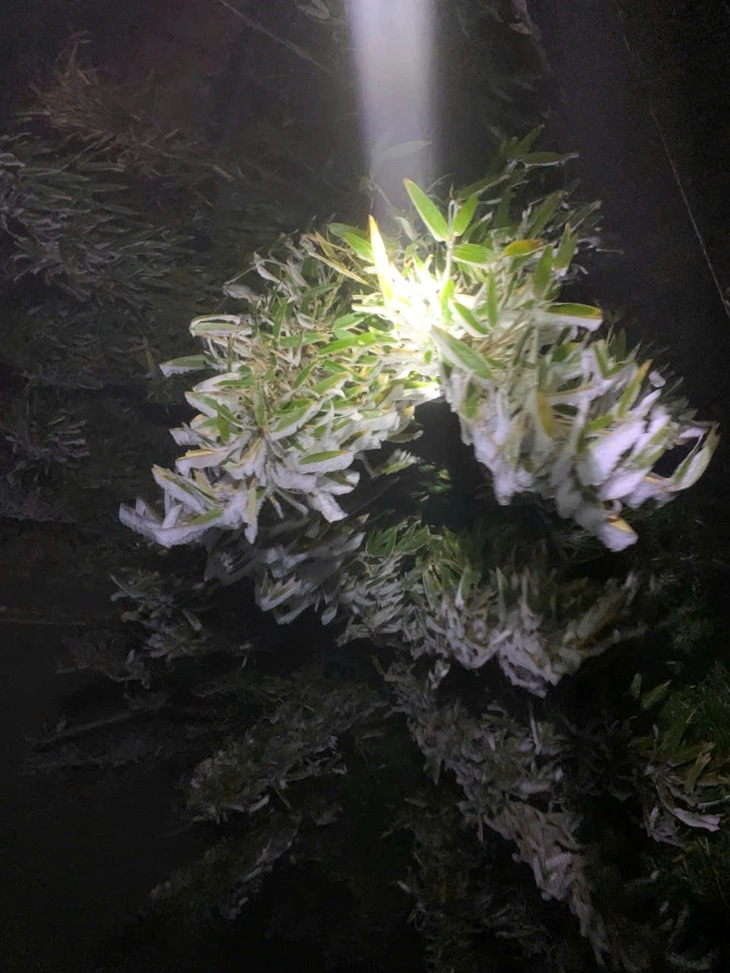 Băng giá bám dày trên cành cây, lối đi trên đỉnh Fansipan - Ảnh: AX |