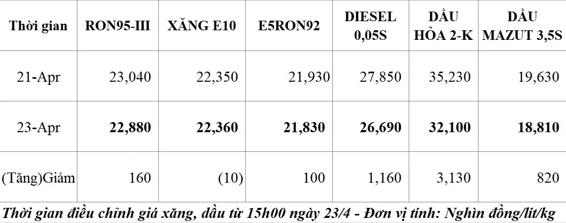 Giá dầu diesel 0.05S từ 15h00 ngày 23/4 giảm 1.160 đồng/lít, giá bán mới là 26.690 đồng/lít; Dầu hỏa giảm mạnh 3.130 đồng/lít, giá bán là 32.100 đồng/lít; Giá dầu mazut 180CST 3.5S kỳ này giảm 820 đồng/lít, giá bán mới là 18.810 đồng/kg.