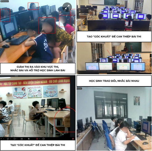 Một số hành vi gian lận được phát hiện bao gồm: Cố tình đặt camera sai vị trí, tạo góc khuất để can thiệp bài thi; chụp, sao chép, phát tán trái phép đề thi, mã ca thi; giám thị ra vào khu vực thi, nhắc bài, hỗ trợ học sinh làm bài và nhiều hành vi gian lận khác.