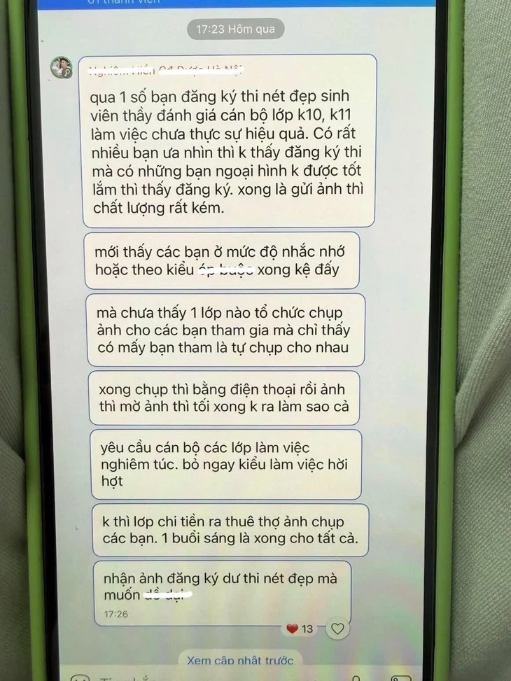 "Có rất nhiều bạn ưa nhìn thì không thấy đăng ký thi, mà có những bạn ngoại hình không được tốt lắm thì thấy đăng ký. Xong gửi ảnh thì chất lượng kém", vị giảng viên viết và yêu cầu ban cán sự ngừng kiểu làm việc hời hợt.