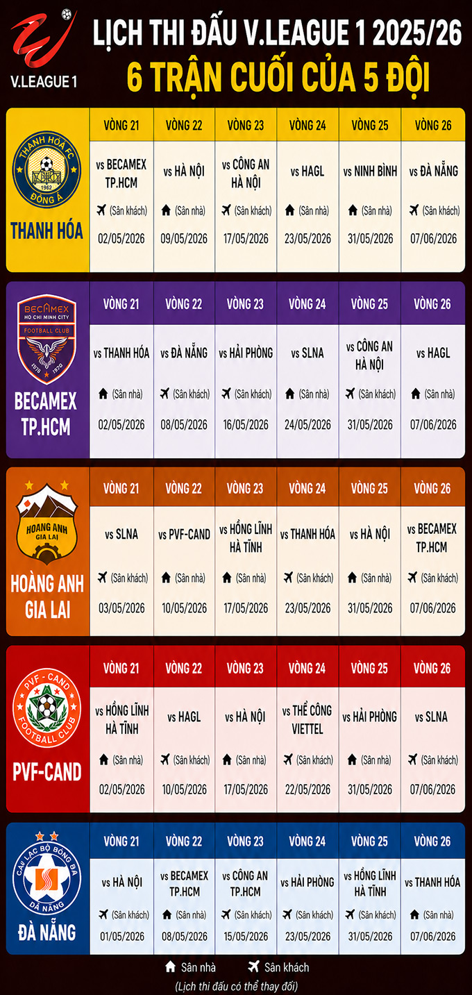 Điều thú vị là lịch thi đấu từ vòng 20 đến 26 chứng kiến hàng loạt những trận “chung kết ngược” giữa các đội nằm trong vùng nguy hiểm. Sau khi thắng PVF-CAND ở vòng 20, Thanh Hóa lại phải đối đầu với Becamex TP.HCM trên sân khách vào ngày 2/5 tới. Lịch thi đấu của Thanh Hóa còn đó hai “trận cầu 6 điểm”, trước HAGL và Đà Nẵng tại vòng 24, 26. Về phần mình, 3 trong 6 trận đấu cuối cùng của Becamex TP.HCM cũng diễn ra trước các đối thủ cạnh tranh vé trụ hạng. Ngoài việc đấu Thanh Hóa ở vòng 21, đội bóng đất Thủ tiếp tục chạm trán Đà Nẵng (vòng 22), HAGL (vòng 26).