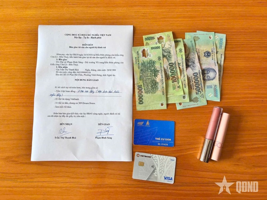 Đến 8 giờ 30 phút ngày 26-4, chủ nhân của chiếc túi xách đã đến Đồn Biên phòng cửa khẩu cảng Cửa Lò – Bến Thủy nhận lại đầy đủ tài sản. Người nhận tài sản bày tỏ sự xúc động, gửi lời cảm ơn sâu sắc tới cán bộ, chiến sĩ đơn vị.