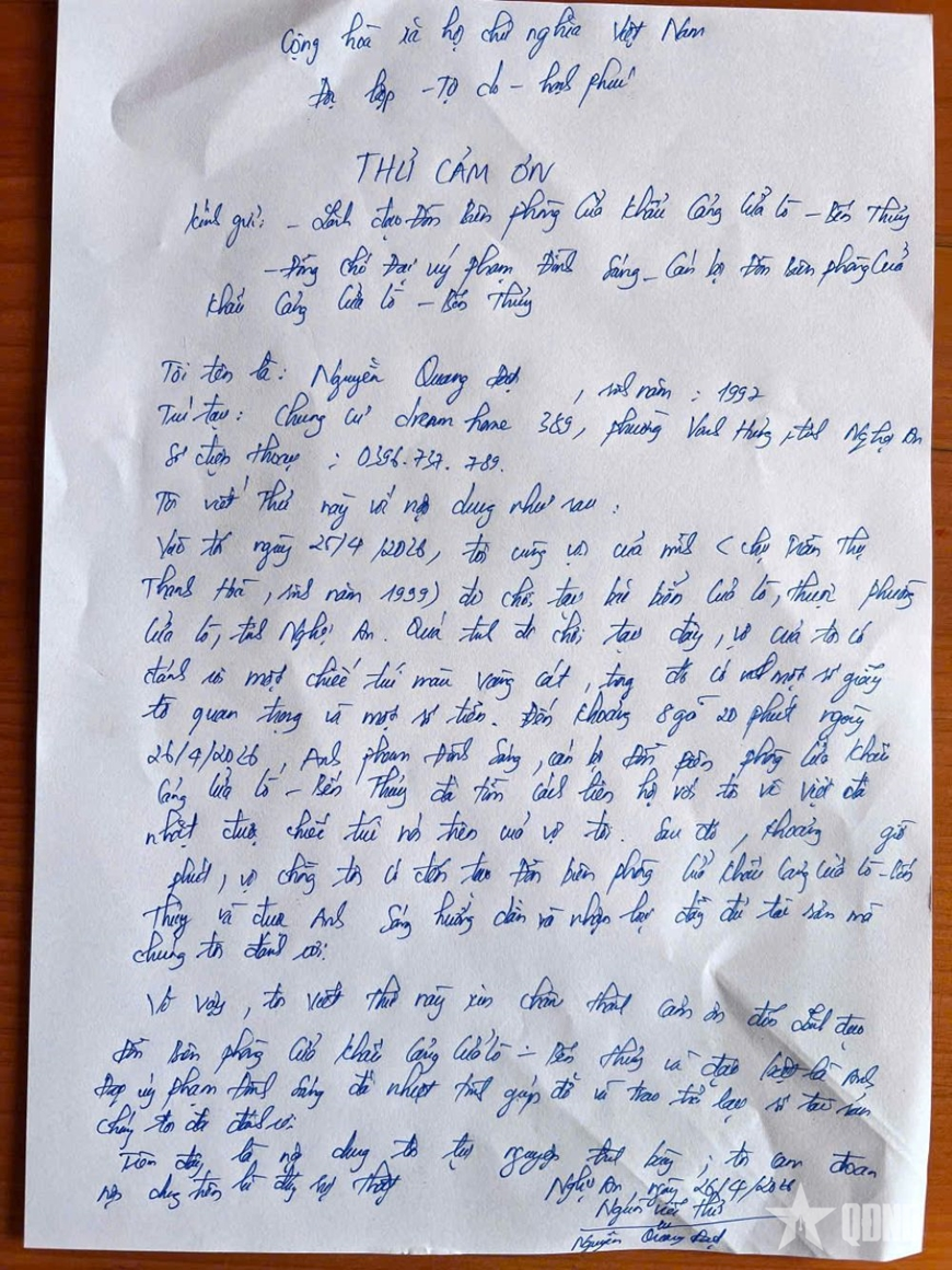 Thư cảm ơn của người được Đại úy Phạm Đình Sáng trả lại tài sản đã mất. |