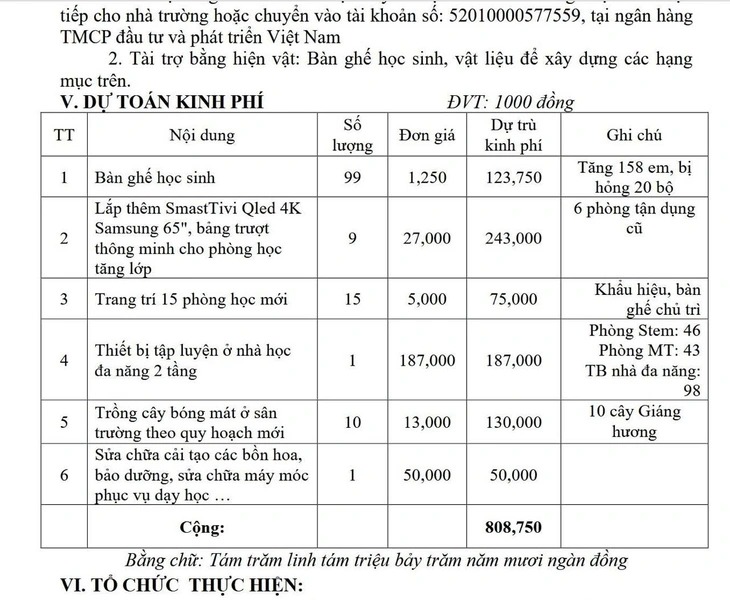Dự toán vận động ủng hộ gồm 6 nội dung gồm: Bàn ghế học sinh; tivi, bảng trượt thông minh cho phòng học; trong trí 15 phòng học mới; thiết bị tập luyện cho khối nhà đa năng; trồng cây bóng mát và sửa chữa cải tạo bồn hoa... với tổng kinh phí hơn 800 triệu đồng.