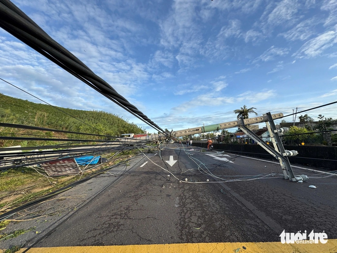 Trụ điện dọc quốc lộ 1 đoạn qua phường Sông Cầu gãy đổ - Ảnh: TRUNG TÂN |