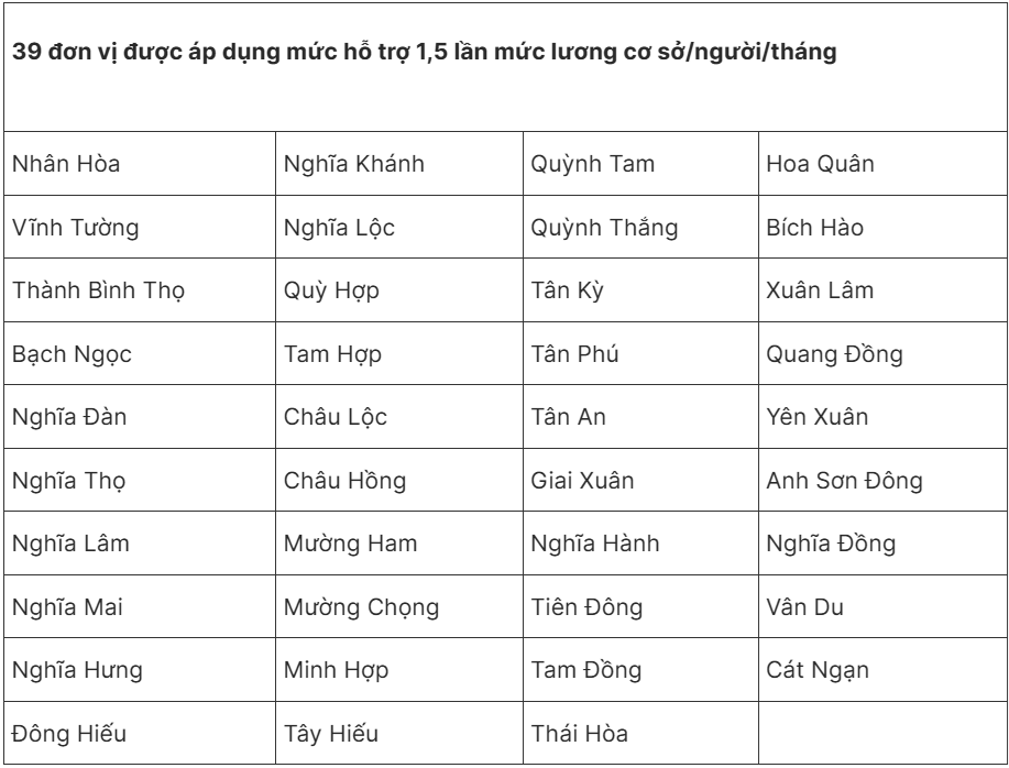 - Nhóm 39 xã miền núi còn lại áp dụng mức hỗ trợ 1,5 lần mức lương cơ sở/người/tháng.